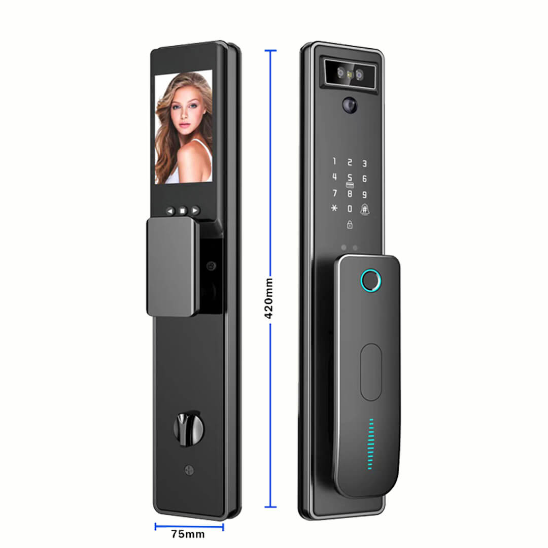 Cerradura inteligente ideal para el hogar, oficina, negocio, departamento. Monitoreo con Reconocimiento facial como forma de acceso adicional. Control de accesos y registros desde tu celular.
